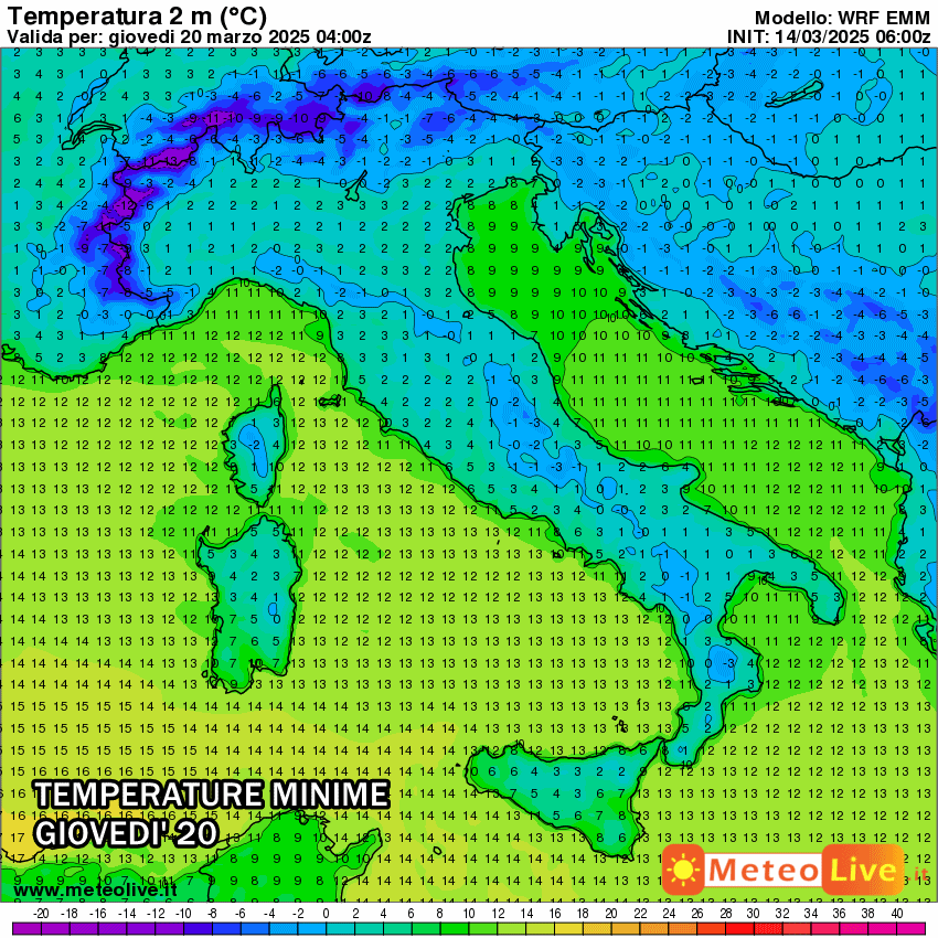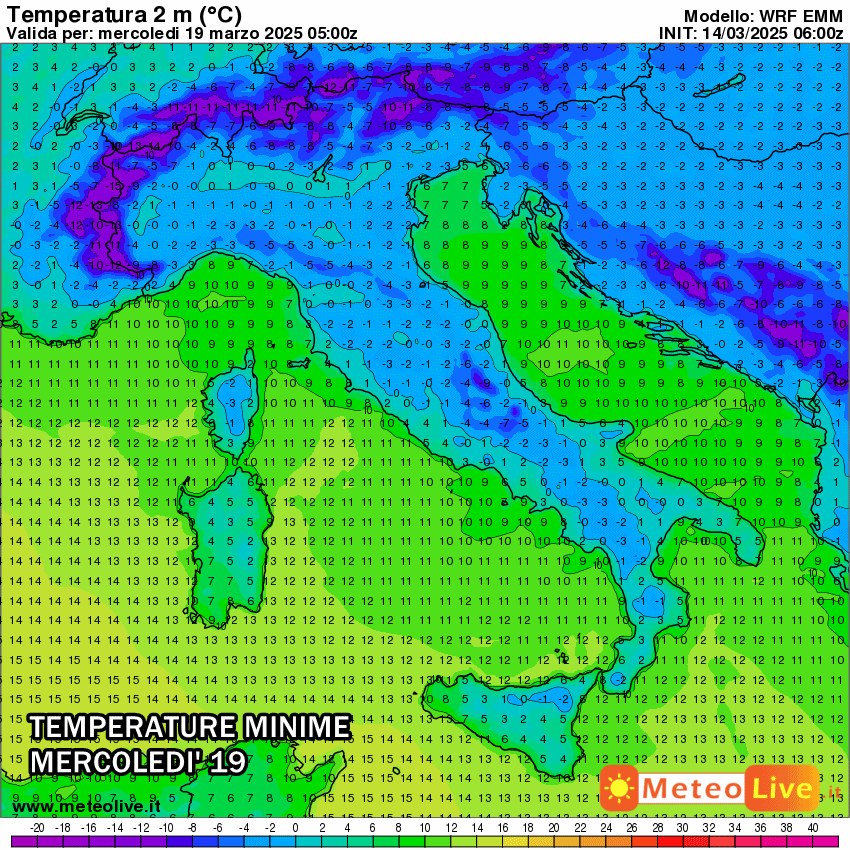 Ancora più freddo nella notte tra mercoledì e giovedì, a causa dei cieli ampiamente sereni e dei venti nettamente più deboli. Le minime potrebbero portarsi fino a -2°C o -3°C nelle aree rurali del Nord e nelle zone interne del Centro Italia, ma il gran freddo, di notte, sarà presente anche sulle regioni del Sud.