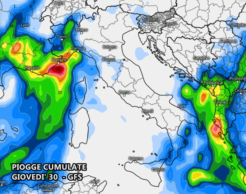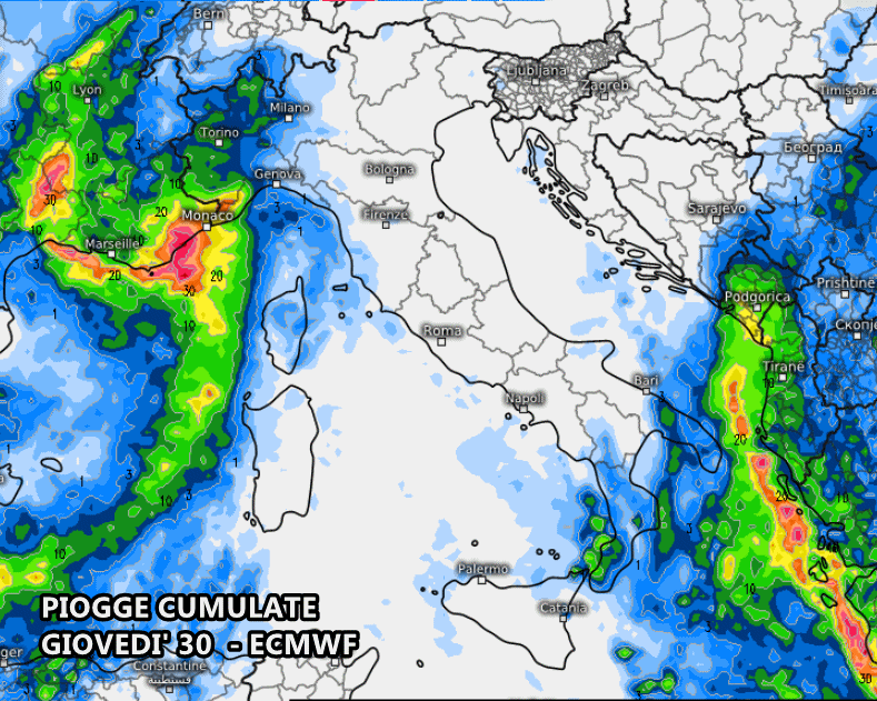 Nella giornata di giovedì 30 gennaio si prevede l’arrivo di un po’ di pioggia su Liguria centro-orientale, Piemonte e Valle d’Aosta, con accumuli blandi o, tuttalpiù, modesti, non superiori ai 25 mm. Qualche piovasco o deboli pioviggini potrebbero bagnare i settori più occidentali della Sardegna, mentre non si esclude qualche acquazzone isolato sulla Puglia meridionale. In questo caso, si tratterà di fenomeni legati all’attuale perturbazione, che nel frattempo si sarà diretta verso la Grecia.