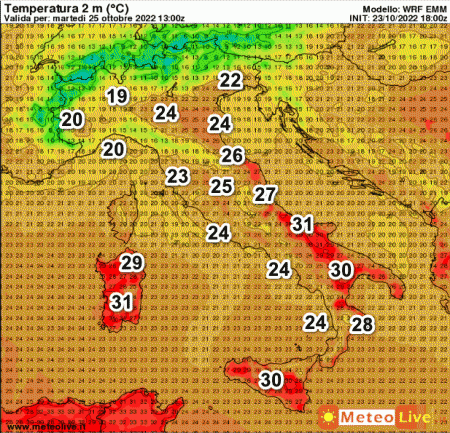 Punte di 31° sulla Sardegna centro-meridionale e il Foggiano, 30° su Sicilia e bassa Lucania, 29° sulla Sardegna settentrionale, 28° sulla Calabria Ionica e 27° in Abruzzo. Ancora leggermente più fresco il clima al nord-ovest.