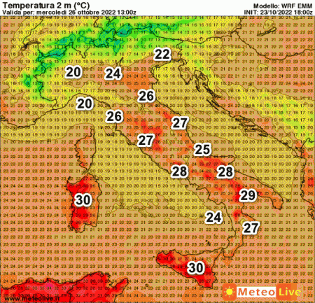 Infine, queste sono le temperature attese in Italia alle ore 15 di mercoledi 26 ottobre: