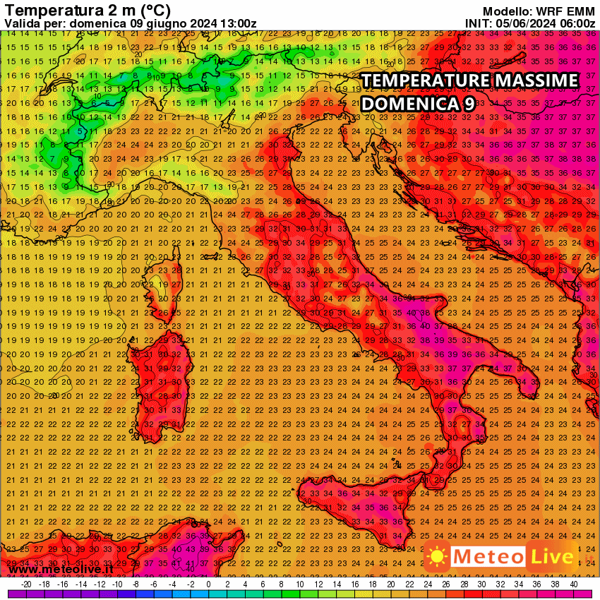 La prima netta spallata alle temperature arriverà tra venerdì e sabato, quando su tutto il Sud e le isole maggiori potremmo raggiungere temperature superiori ai 32-33°, ma saremo ancora lontani dall’apice del caldo previsto solo tra domenica e martedì. Eloquente la mappa delle temperature massime previste nel weekend che ci mostra punte localmente di 38-40° nelle zone interne del meridione, soprattutto su Puglia e Sicilia.