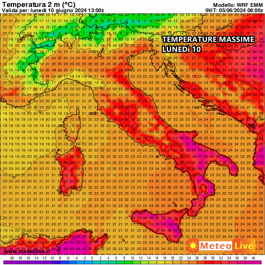Grande caldo anche a inizio settimana, con il caldo grande protagonista su tutto il Sud con punte massime fino a 40° sulla Sicilia orientale. Man mano che ci spostiamo verso Nord, le temperature scendono fino a portarsi attorno alle medie del periodo al Nord, dove invece avremo a che fare con tanti acquazzoni e violenti temporali.