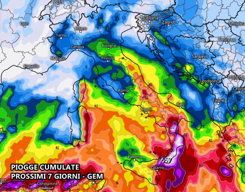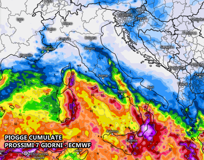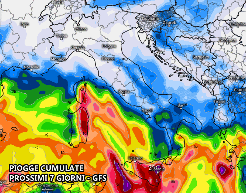 Secondo il modello americano GFS, le precipitazioni previste nei prossimi giorni saranno meno abbondanti ma comunque significative. In Sicilia, ad esempio, si stimano punte di oltre 200 mm di pioggia totali nei prossimi 7 giorni.