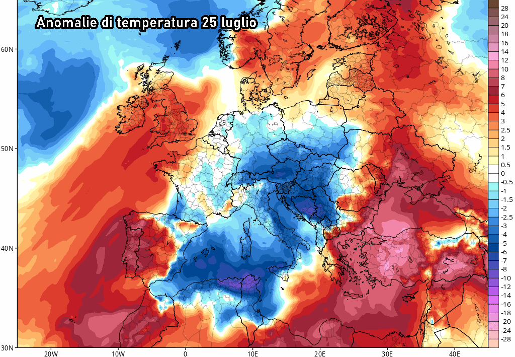 L’aria calda subtropicale farà molta fatica ad abbandonare il meridione e, difatti, almeno fino a venerdì mattina, continuerà a far davvero molto caldo su tutto il Sud e le isole maggiori. Ma sarà solo questione di pazienza, poiché entro la sera di venerdì 25 luglio l’aria fresca potrebbe davvero dilagare in ogni angolo d’Italia, causando un calo termico di oltre 10 °C, ponendo addirittura le temperature di qualche grado sotto le medie del periodo.