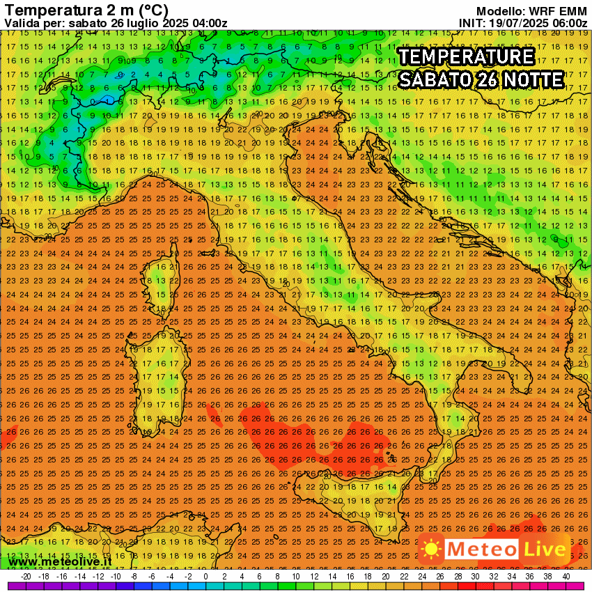 La notte tra venerdì e sabato 26 luglio potrebbe essere decisamente fresca e gradevole in ogni angolo d’Italia, poiché si prevedono temperature anche al di sotto dei 18 o 17 °C nelle aree interne da Nord a Sud.
