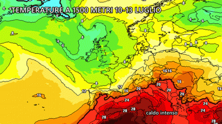 Di seguito possiamo notare le temperature previste a 1500 metri tra 10 e 13 Luglio, decisamente elevate al centro, a sud e sulle isole. Valori superiori ai 25°C indicano la presenza di aria molto calda, tipica delle ondate di caldo più forti ed eccezionali. Naturalmente siamo ancora troppo in là coi tempi, per cui sarà necessario attendere ulteriori aggiornamenti a riguardo.