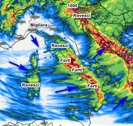 Al centro i rovesci arriveranno tra la sera e la notte su lunedi 9 gennaio e colpiranno il Tirreno, le aree interne e la Sardegna, lasciando in ombra pluviometrica il versante adriatico.