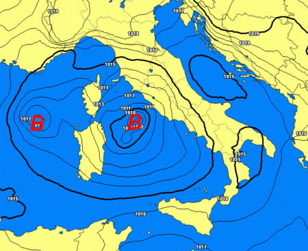 In verità è presente un’altra depressione ad ovest della Sardegna, ma dovrebbe perdere di importanza. Il ciclone vero e proprio risulta al momento posizionato tra la Sardegna e il Lazio e nelle prossime ore dovrebbe muoversi verso nord-est.