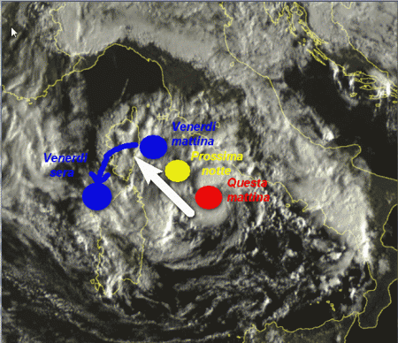 In rosso la sua posizione attuale; in giallo quella che occuperà alla mezzanotte su venerdi 3 marzo. In blu la sua posizione prevista alle ore 7 di domani mattina, ovvero poco ad est della Corsica. Dalla tarda mattinata, il piccolo ciclone dovrebbe attenuarsi e piegando sulla sua sinistra andrà a morire domani sera (venerdi) sul Golfo dell’Asinara, in Sardegna.