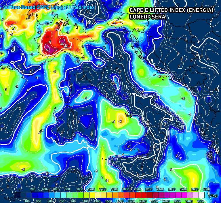 Tuttavia, è molto probabile che improvvisi forti temporali possano svilupparsi anche sulla Val Padana centro-orientale tra la sera di lunedì e la notte di martedì, dando luogo a numerose fulminazioni, grandinate intense e fortissime raffiche di vento. Con valori di energia — ovvero CAPE e Lifted Index — così elevati, è molto probabile l’arrivo di temporali con fenomeni violenti, sebbene localizzati.