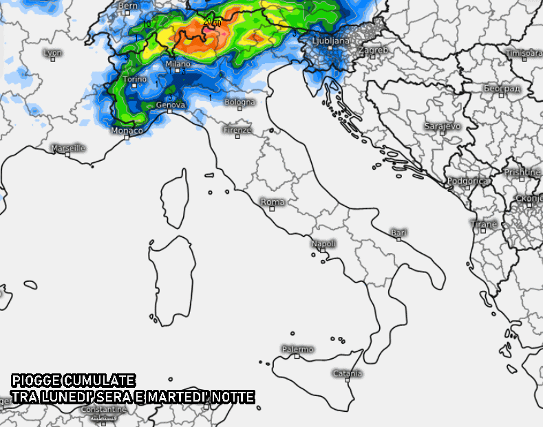 I fenomeni tenderanno a coinvolgere soprattutto Alpi e Prealpi tra lunedì pomeriggio e la notte di martedì, come si evince anche dalle precipitazioni totali previste in questo lasso di tempo.