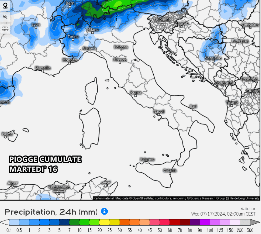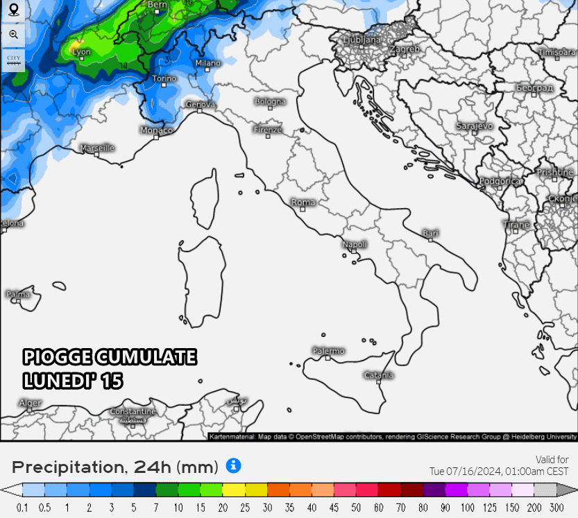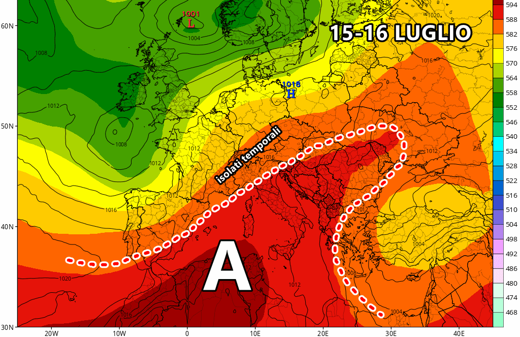 L’anticiclone sarà molto più coriaceo al centro-sud, mentre al nord sarà un po’ meno spesso, in altezza, lasciando modo ai temporali di poter proliferare con più facilità. In effetti ci sarà un modesto rischio di temporali serali, soprattutto su Piemonte, Valle d’Aosta e Lombardia occidentale.