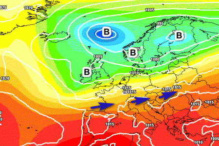 Ecco il flusso di correnti occidentali relativamente fresche ed instabili che interesseranno le regioni settentrionali e parte di quelle centrali. Al sud e sulle Isole pressione più alta e condizioni di tempo nettamente migliori. In altre parole, sembra un avvio di luglio vecchio stile, senza la presenza ingombrante dell’alta pressione africana sul Mediterraneo.
