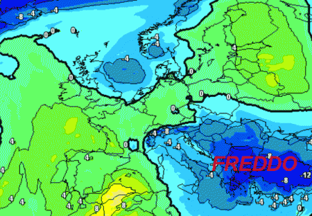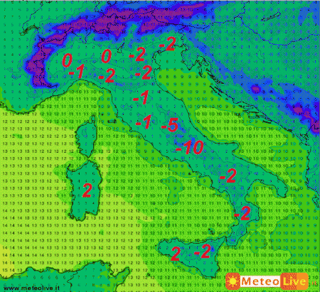 Punte di -4° alla medesima quota saranno presenti sul nord-ovest ed al centro-sud. Altrove le isoterme saranno comprese tra 0 e -2°.