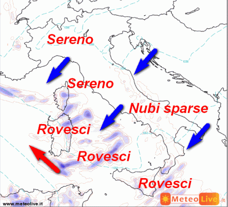 Le correnti fredde da nord-est contrasteranno in maniera residua con venti piu umidi da sud-est in prossimità delle due Isole Maggiori, dove avremo ancora dei rovesci, ma in attenuazione nell’arco della giornata. Un po’ di nubi sparse senza fenomeni saranno presenti sul medio-basso Adriatico e il restante meridione. Sul resto d’Italia gran sole e gran secco.