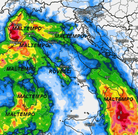 Maltempo al nord-ovest, specie su Piemonte e ponente ligure con neve sopra i 1200-1400 metri; maltempo con temporali anche sulla Sardegna, l’Emilia Romagna e il settore ionico. Rovesci sul medio e alto Tirreno, per il resto tempo più asciutto o con piogge poco probabili.