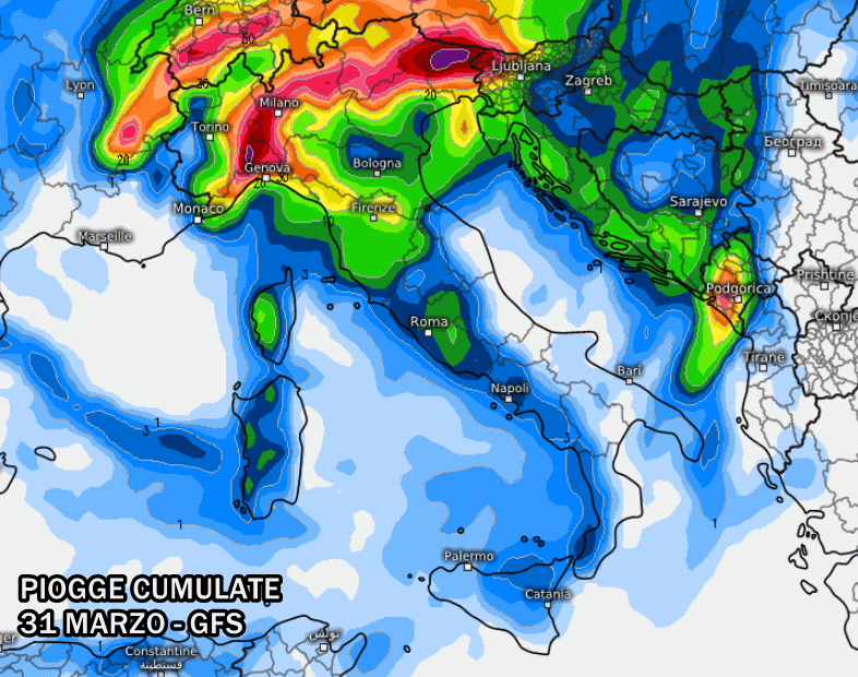 Nel frattempo, le prime proiezioni pluviometriche indicano un 31 marzo particolarmente turbolento per il Nord Italia, con abbondanti piogge e accumuli significativi soprattutto sul Nord-Ovest.