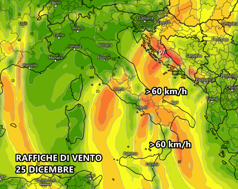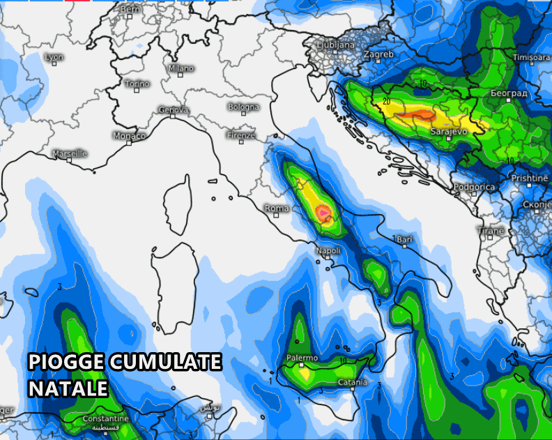 Un discorso completamente diverso vale per il Medio-Basso Adriatico e il Sud Italia, dove, dopo il passaggio del fronte freddo previsto per il 23 dicembre, si prospetta l’isolamento di un nucleo freddo in alta quota tra la Vigilia di Natale e il 25 dicembre. Non sarà un nucleo di aria gelida capace di portare nevicate fino in pianura, ma porterà comunque instabilità diffusa. Tra il 24 e il 25 dicembre, ci aspettiamo precipitazioni su Marche, Abruzzo, Molise, Puglia, Basilicata, Calabria e Sicilia.