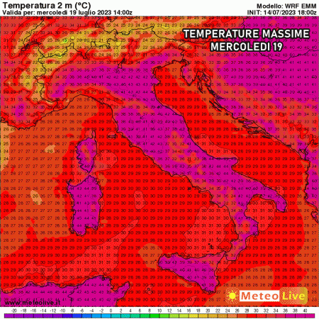 Temperature così alte in quota favoriranno un aumento netto delle temperature su tutta Italia, soprattutto al centro, al sud e sulle isole maggiori. Su questi settori le temperature massime saliranno quasi ovunque oltre i 33-35°C per molti giorni consecutivi tra 16 e 20 Luglio. Nei settori interni la colonnina di mercurio raggiungerà agevolmente i 38-41°C, fino a sfiorare i 43-44°C in aree critiche come nelle aree interne della Sardegna, il catanese, il siracusano, l’ennese, il foggiano.