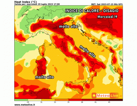 Eloquente la mappa dell’indice di calore, che ci mostra l’intensità del disagio bio-climatico previsto nella giornata di mercoledì 19, quella che teoricamente potrebbe rivelarsi la giornata più calda.