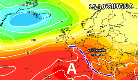 Difatti tra 25 e 30 Giugno il promontorio anticiclonico sarà totalmente cancellato e la calura sub-tropicale indietreggerà su Spagna, Algeria e Marocco. L’Italia si ritroverà sotto correnti meno calde nord-occidentali, le quali faranno scendere ovunque le temperature fino a portarle attorno alle medie del periodo. Insomma non farà fresco, ma nemmeno troppo caldo! Le temperature massime oscilleranno tra i 25 i 30°C sul centro e sud Italia, mentre in Val Padana la colonnina di mercurio si assesterà tra i 32 e i 35°C, seppur in condizioni di minor disagio grazie ad un calo dell’umidità. In questo finale di GIugno potremmo imbatterci anche in alcune note instabili, prevalentemente pomeridiane.