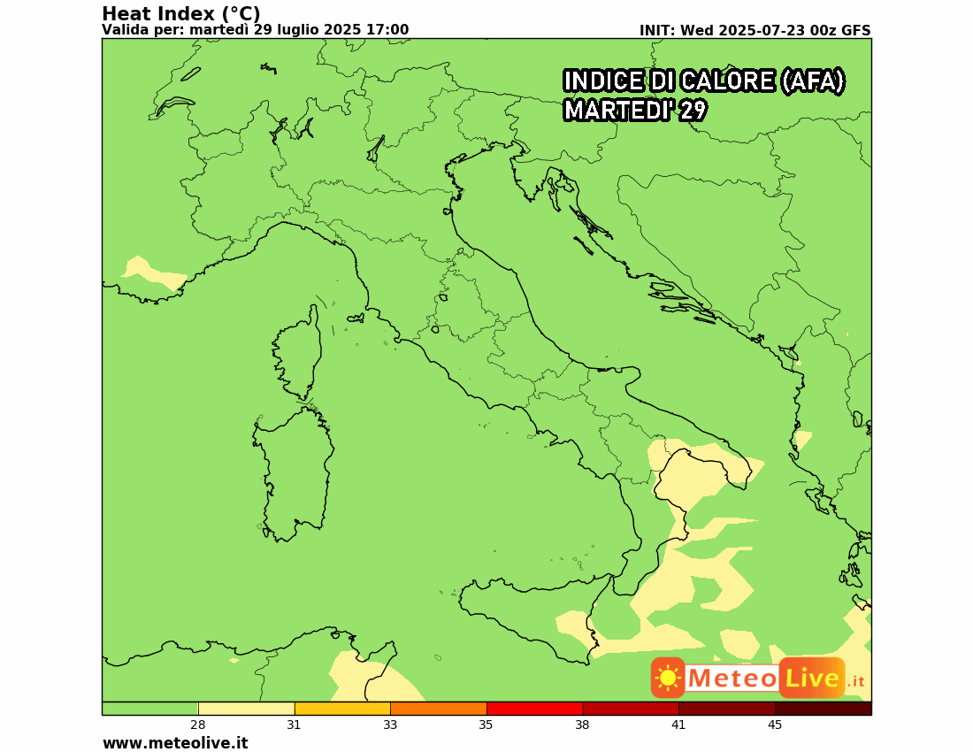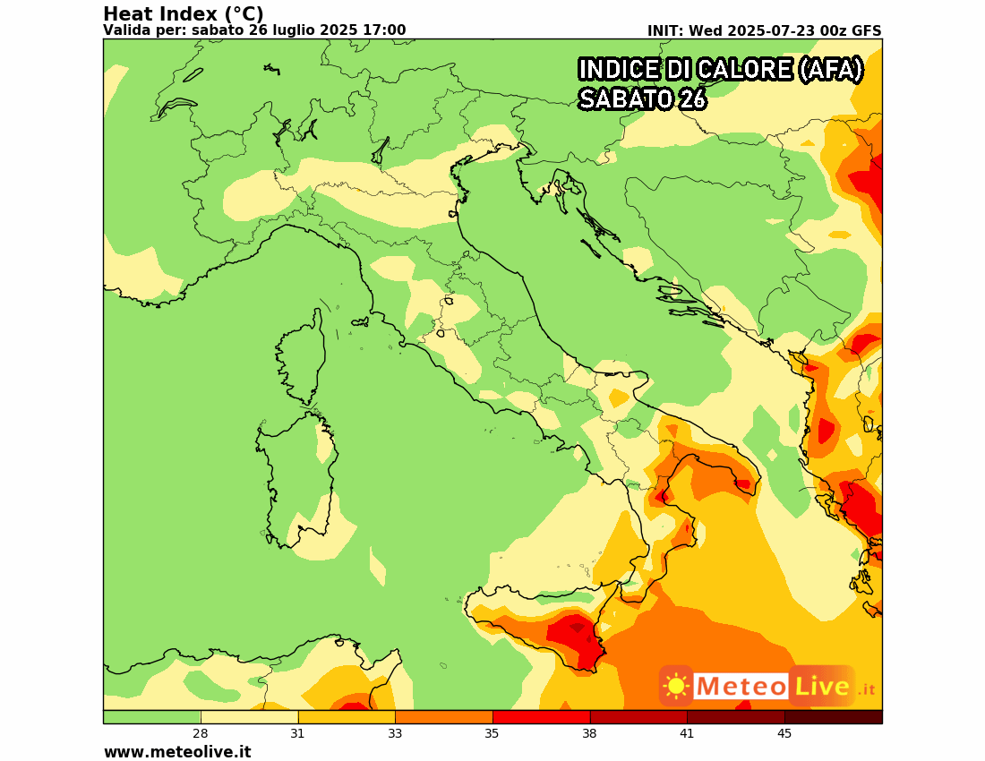 Eloquente l’indice di calore previsto sabato, che ci mostra tutto il centro-Nord Italia quasi interamente fuori dalla calura sub-tropicale. Chiaramente il caldo non sparirà, poiché in pieno giorno potremo comunque raggiungere temperature vicine ai 30 °C, ma il disagio legato all’afa e all’umidità sarà quasi del tutto azzerato. Resisterà un po’ di afa, sabato, solo al Sud: ma anche qui è solo questione di pazienza, in quanto da domenica i venti più freschi nord-occidentali faranno scendere ulteriormente la temperatura.