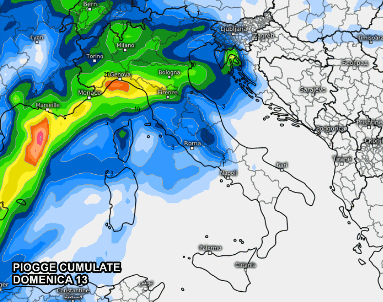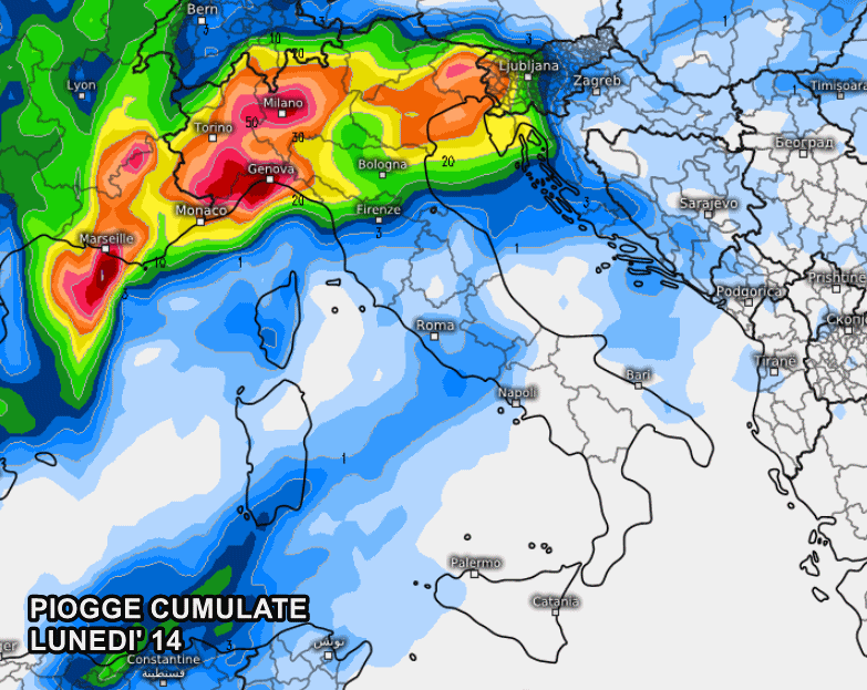 Il maltempo poi si intensificherà ulteriormente nella giornata di lunedì 14 aprile, con piogge che potrebbero inglobare tutto il Nord e anche buona parte del medio Tirreno. Le precipitazioni potrebbero rivelarsi piuttosto insidiose per le regioni settentrionali, specie su Liguria, Piemonte, Lombardia, Emilia e Toscana.