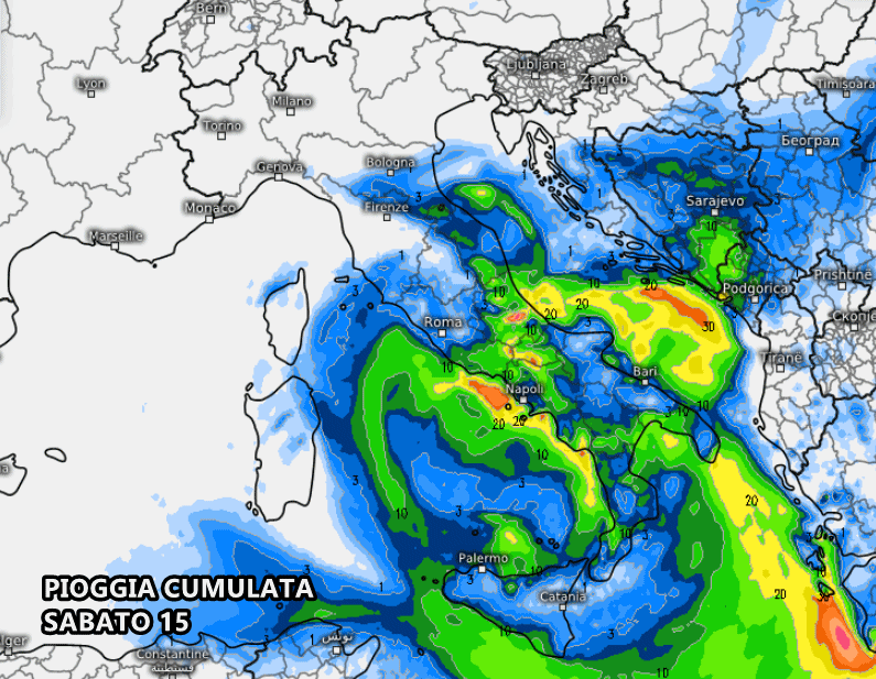 Nel corso di questo sabato, la perturbazione si sposterà rapidamente verso il Centro-Sud, portando piogge diffuse, rovesci e anche nevicate, a tratti abbondanti, sull’Appennino centrale, fino a quote di alta collina. In particolare, ci aspettiamo nevicate su Marche, Abruzzo e Molise, indicativamente tra i 500 e i 700 m di altitudine, mentre al Sud Italia la quota neve sarà leggermente più elevata.