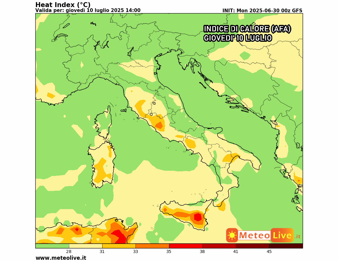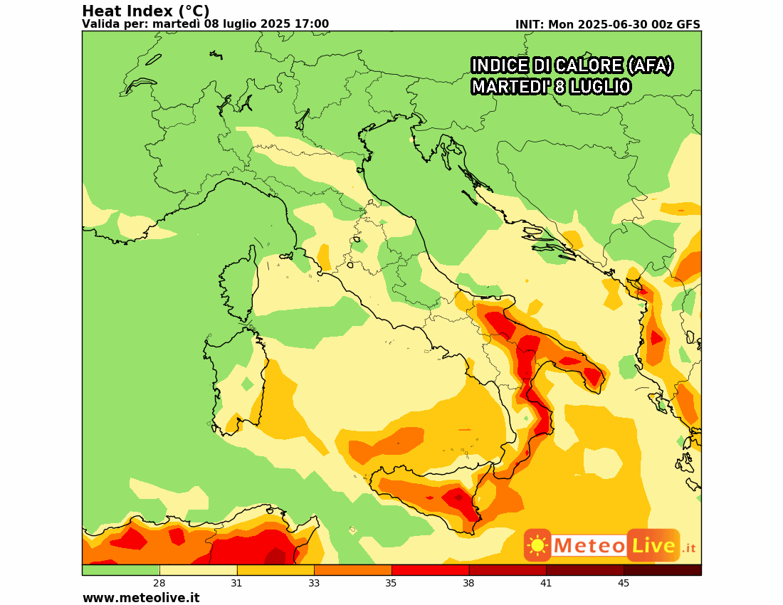 Eloquenti le previsioni dell’indice di disagio, ovvero il fastidio prodotto dal caldo afoso: al Nord Italia l’afa precipiterà drasticamente a partire da martedì 8 luglio, mentre resisterà il caldo afoso sul resto della penisola e soprattutto al Sud.