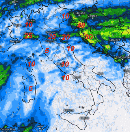 Sono attesi fino a 25mm di pioggia sulla Liguria centro-occidentale; 20mm sono attesi sulla Romagna fino al Bolognese; 10mm sono attesi nel Milanese, sul Friuli, sulla Corsica, sulle Marche e nel Lazio; 5mm cadranno invece sulla Sardegna e sulla Toscana. Su tutte le altre regioni non dovrebbe piovere.