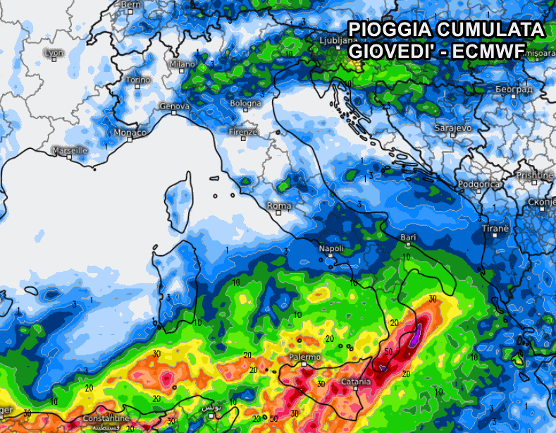 Un vero e proprio mix esplosivo, che causerà la formazione di un ciclone carico di maltempo. Sarà il sud Italia il bersaglio principale di questa depressione: si prevede l’arrivo di temporali e piogge diffuse, di stampo più autunnale che primaverile! Non a caso gli accumuli previsti sono molto estesi ed anche importanti, con picchi di oltre 100 mm nella sola giornata di giovedì. Sicilia e Calabria saranno le due regioni più colpite.