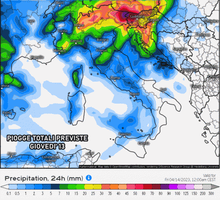 Gli accumuli di pioggia più importanti sono previsti proprio sul Triveneto, specie a ridosso dei monti. Non si escludono punte di 90-100 mm nelle sole 24 ore di giovedì sul Nordest. Piogge più disorganizzate per il Nordovest, in larga parte previste tra stasera e le prime ore della notte.