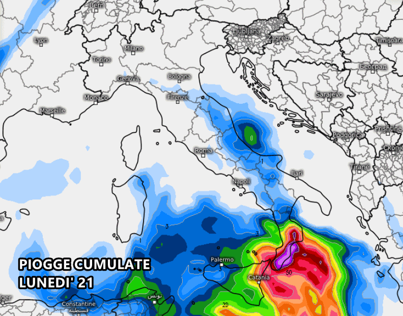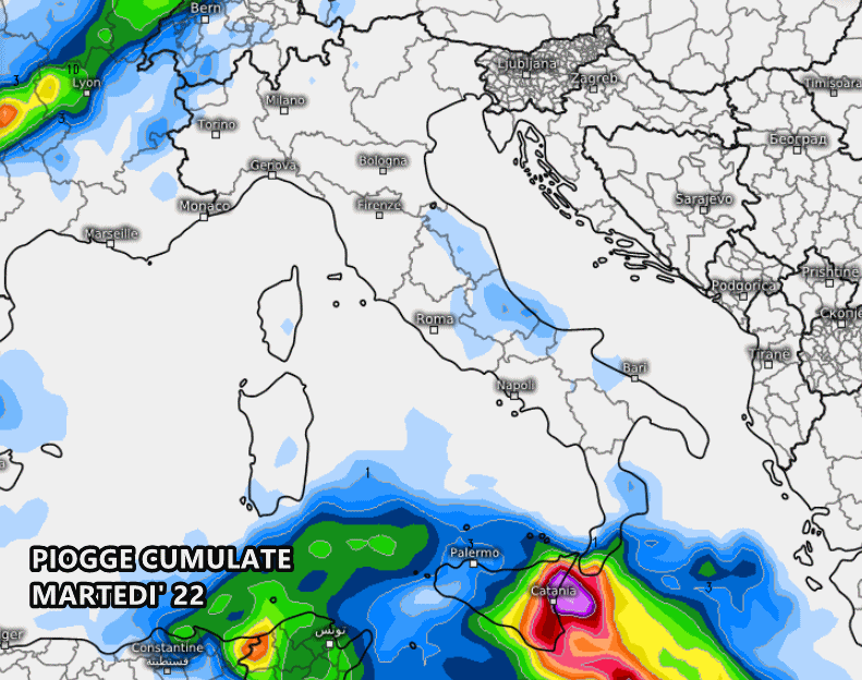 Martedì 22 Ottobre il maltempo potrebbe concentrarsi principalmente in Sicilia, con accumuli eccezionali di oltre 100 mm sui settori orientali, i quali andranno a sommarsi a tutti quelli dei giorni precedenti: