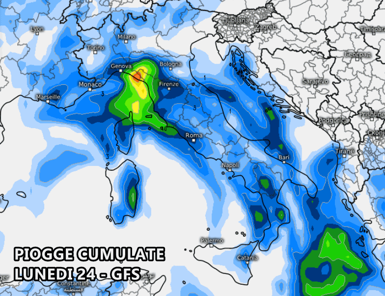 Anche in Italia, con l’arrivo della prossima settimana, potremmo imbatterci in situazioni di maltempo su diverse nostre regioni. Il modello americano GFS propone il ritorno della pioggia nella giornata di lunedì 24 febbraio, soprattutto al Nord-Ovest e al medio-alto Tirreno, ma nella mappa seguente si possono notare precipitazioni sparse anche al Sud, sebbene con accumuli pluviometrici di poco conto.