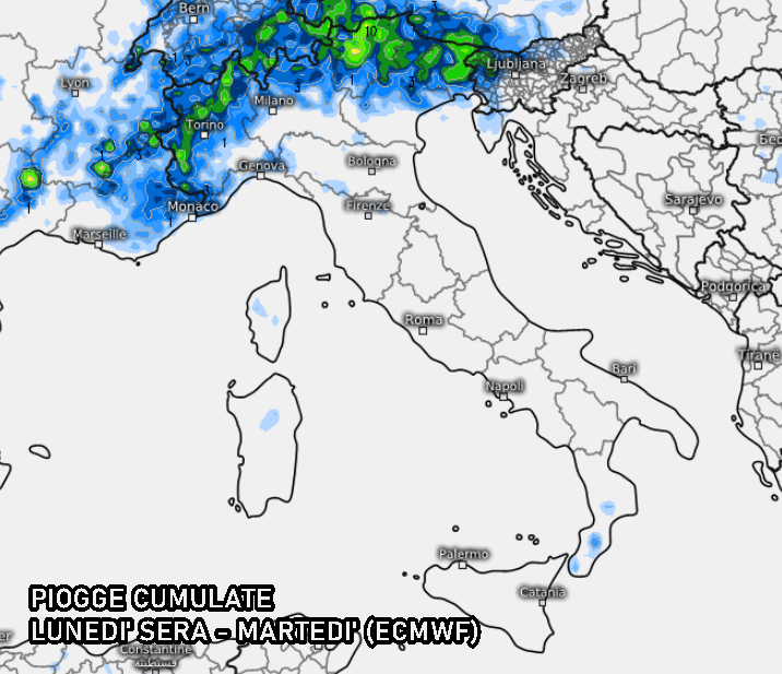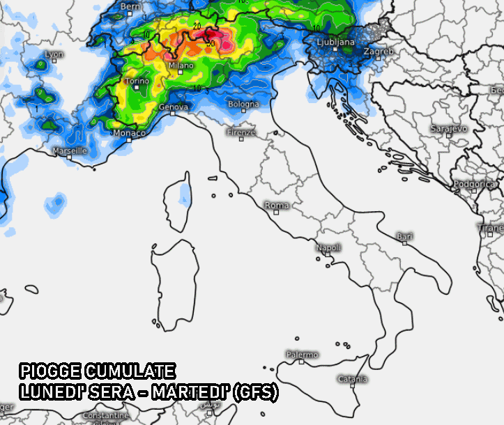 Tra la tarda sera di lunedì e la prima parte della notte su martedì questi temporali potrebbero interessare anche il resto della Val Padana, specie tra Lombardia, Veneto e Friuli Venezia Giulia. Il modello americano GFS è al momento il più carico di precipitazioni per il Nord.
