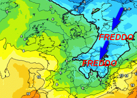 La prima mappa ci mostra le temperature a 1500 metri attese in Europa nella notte tra giovedi 14 e venerdi 15 ottobre…tra una settimana esatta.