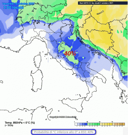 Quante probabilità ci sono che questo evento si verifichi? Per rispondere a questa domanda, esaminiamo la mappa della probabilità che l’isoterma 0° a 1500 metri possa raggiungere l’Italia nel periodo suddetto: