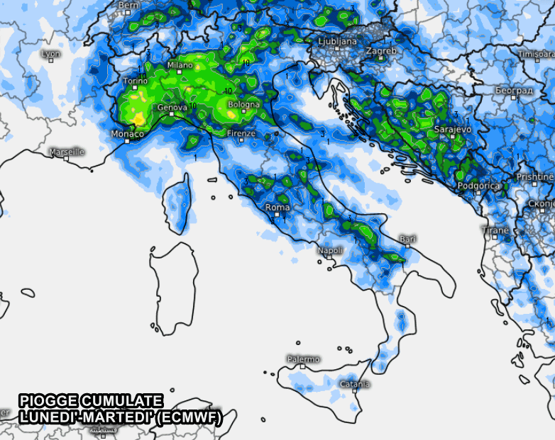 Molto più incisivo il peggioramento secondo il modello europeo ECMWF. Rovesci e temporali potrebbero colpire gran parte del nord Italia, tra lunedì sera e la notte su martedì. Questi temporali potrebbero dar luogo a grandinate e colpi di vento specie tra Piemonte, Lombardia, Liguria, Emilia.