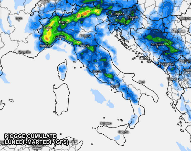 Lunedì fra il tardo pomeriggio e soprattutto la serata i primi temporali coinvolgeranno il Nord-ovest, per poi estendersi sulle regioni centrali e marginalmente sul Nord-est durante la notte di martedì. Secondo il modello americano GFS gli accumuli più abbondanti sono attesi sul Piemonte e l’arco alpino/prealpino fra sera e notte: