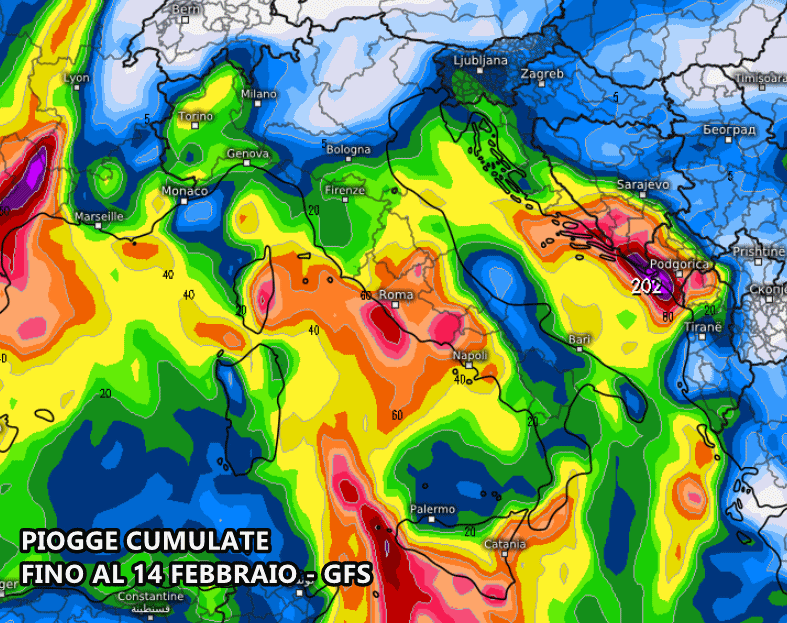 Secondo il modello americano GFS, le piogge potrebbero bagnare gran parte dello Stivale nel corso dei prossimi 10 giorni. Troviamo alcune zone in ombra come Veneto, Friuli, Trentino alto Adige, Lombardia orientale, Emilia occidentale, basso Molise e foggiano. Accumuli degni di nota invece su Lazio, Campania, Sicilia, bassa Calabria dove si prevedono picchi di oltre 100 mm.