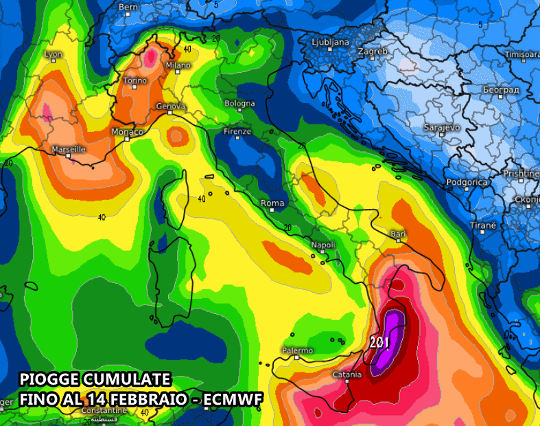 Il modello europeo ECMWF mostra scenari decisamente peggiori per l’arco ionico, con accumuli ragguardevoli in Calabria. Si prevedono picchi superiori ai 200 mm sulla Calabria ionica, fino a 100-150 mm su metapontino, Sicilia orientale. Precipitazioni importanti anche sul Nordovest, con picchi oltre 70-90 mm.