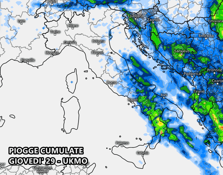 Più corposo il peggioramento secondo il modello inglese UKMO. Rovesci e temporali potrebbero colpire in maniera abbastanza diffusa Abruzzo, Molise, Puglia, Basilicata, Calabria e Campania. Accumuli fino a 40-50 mm tra Basilicata e Calabria, indice della presenza di temporali piuttosto forti a ridosso dei monti.