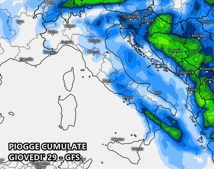 Il modello americano GFS mostra un peggioramento molto blando, con piovaschi in transito sul medio-basso Adriatico e al sud. Rovesci o temporali un po’ più consistenti potrebbero interessare Basilicata e Calabria centro-settentrionale. Non escludiamo isolati temporali pomeridiani anche sul Triveneto.