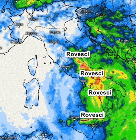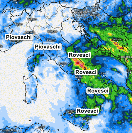 In questo frangente avremo un’Italia divisa in due: al nord, sulla Toscana e sulla Sardegna tempo abbastanza stabile, mentre sul medio Adriatico, le aree interne e il meridione sarà il maltempo a comandare la scena meteorologica con temporali, grandinate e persino la neve oltre i 1500 metri.