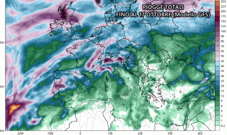 Sono significative le precipitazioni previste dal modello americano fino al 17 ottobre, in gran parte concentrate proprio attorno a metà mese, con picchi anche superiori ai 90-100 mm di pioggia.