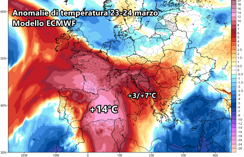 Clamorose le anomalie previste per questi due giorni. Addirittura spiccano fino a 14° di anomalia positiva sul Mediterraneo occidentale, mentre in Italia le temperature potrebbero essere di circa 3-7°C superiori alla norma.