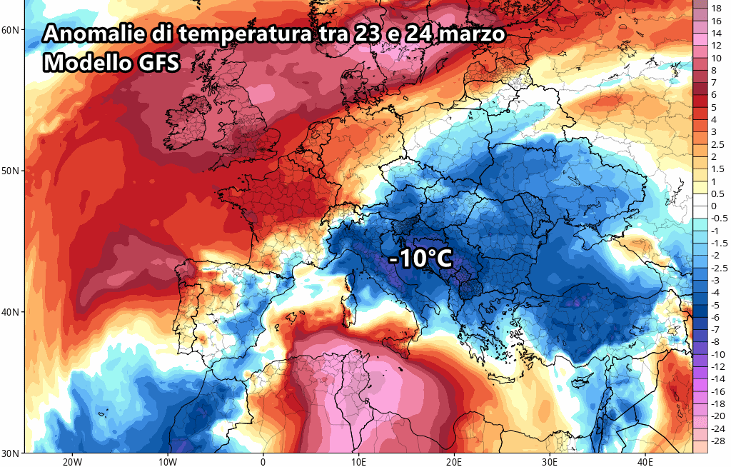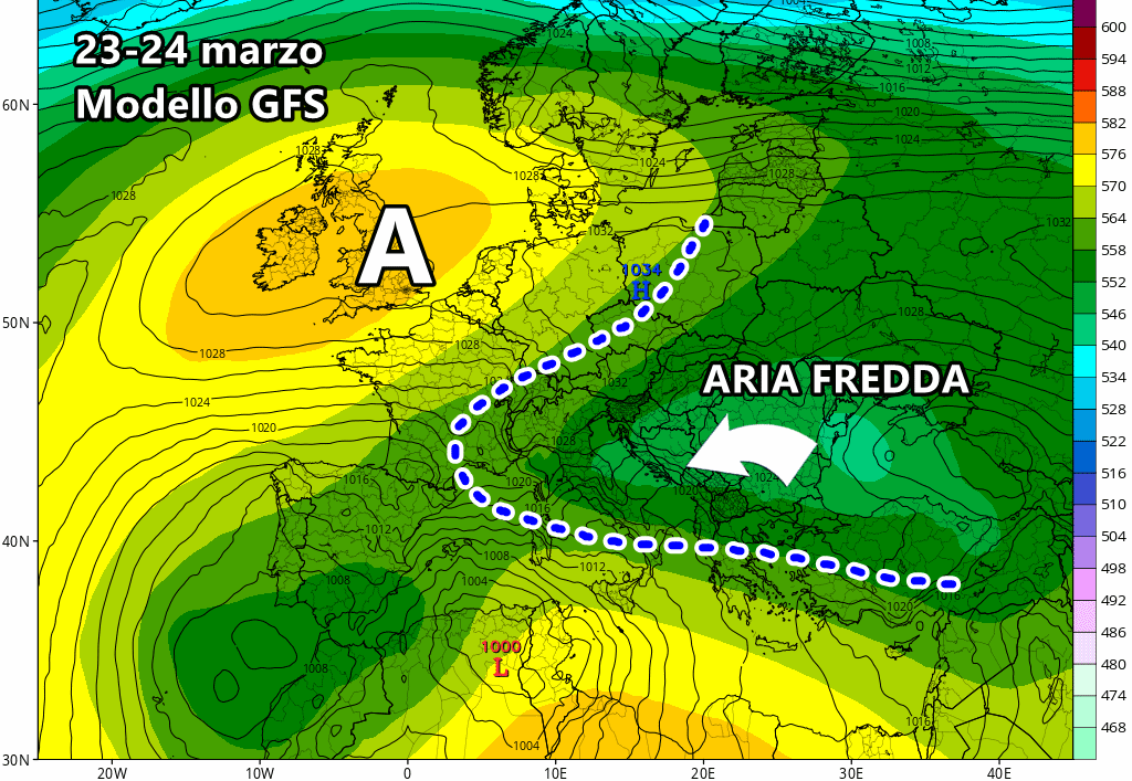 Il modello americano GFS, invece, ribalta tutto mostrano addirittura scenari invernali. L’alta pressione delle Azzorre si mostra molto più vivace e potenzialmente in grado di raggiungere la Gran Bretagna, fino ad incunearsi verso il mar Baltico. Questo impedirebbe l’arrivo di aria calda sub-tropicale in Italia e contemporaneamente favorirebbe la discesa di aria fredda dall’est Europa verso lo Stivale tra 23 e 24 marzo.