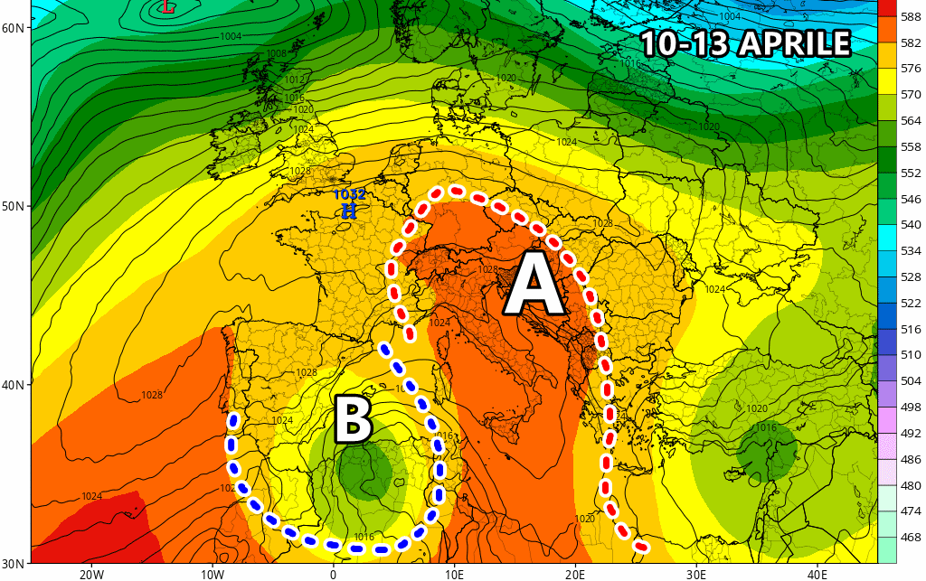 L’alta pressione tra venerdì e il lunedì è ormai confermata e già in questo lasso di tempo potremmo percepire temperature tardo primaverili e localmente anche estive, soprattutto sul centro sud delle isole maggiori. Ma a quanto pare l’ondata di caldo potrebbe protrarsi anche nel corso della prossima settimana, persistendo almeno fino al 13 Aprile. Il modello americano GFS infatti propone un’ulteriore rinforzo dell’anticiclone tra il 10 e il 13 Aprile, a seguito dell’isolamento di una depressione sul Mediterraneo occidentale. Questa configurazione barica potrebbe dar nuova linfa all’alta pressione, garantendo non solo ancora tempo stabile nel corso della prossima settimana, ma anche un’ulteriore aumento termico con valori anche oltre i 30 °.