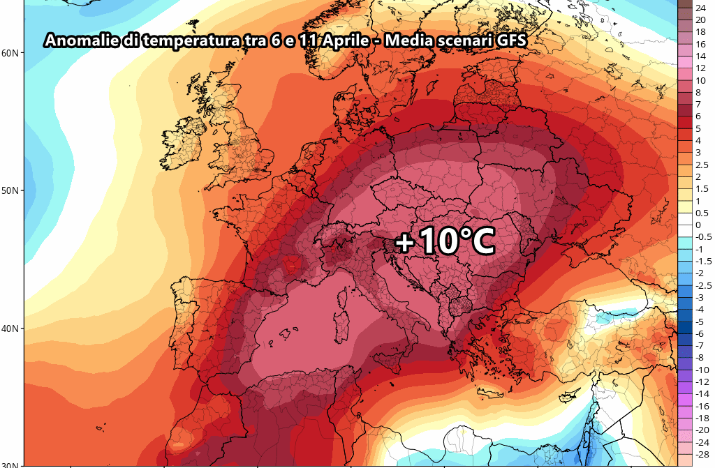 Difatti, analizzando la mappa delle anomalie previste tra il sei e l’undici Aprile possiamo notare chiaramente l’entità di questa ondata di caldo che andrà a compiersi tra pochi giorni. Gran parte d’Italia e addirittura anche diversi paesi del Centro Est Europa potrebbero registrare anomalie di oltre 10 ° rispetto alle tipiche medie del periodo.