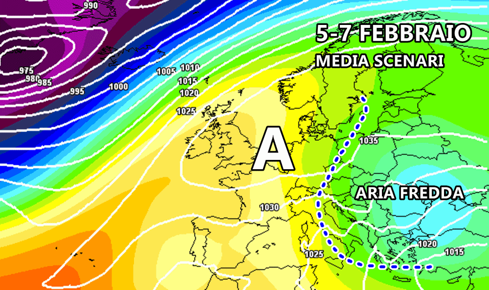 La media degli scenari, che al momento indica la previsione più probabile, non mostra nulla di tutto questo, poiché l’alta pressione risulterebbe ancora abbastanza forte nel periodo indicato tra il 5 e il 7 febbraio. L’aria fredda, infatti, in un primo tempo resterebbe quasi interamente confinata sull’Est Europa e sui Balcani, o al massimo potrebbe lambire il medio-basso Adriatico e il Sud, portando solo rari fenomeni nevosi a quote basse, mentre solo successivamente, dal 7 sera in poi potrebbe invadere tutta l’Italia in modo più netto.